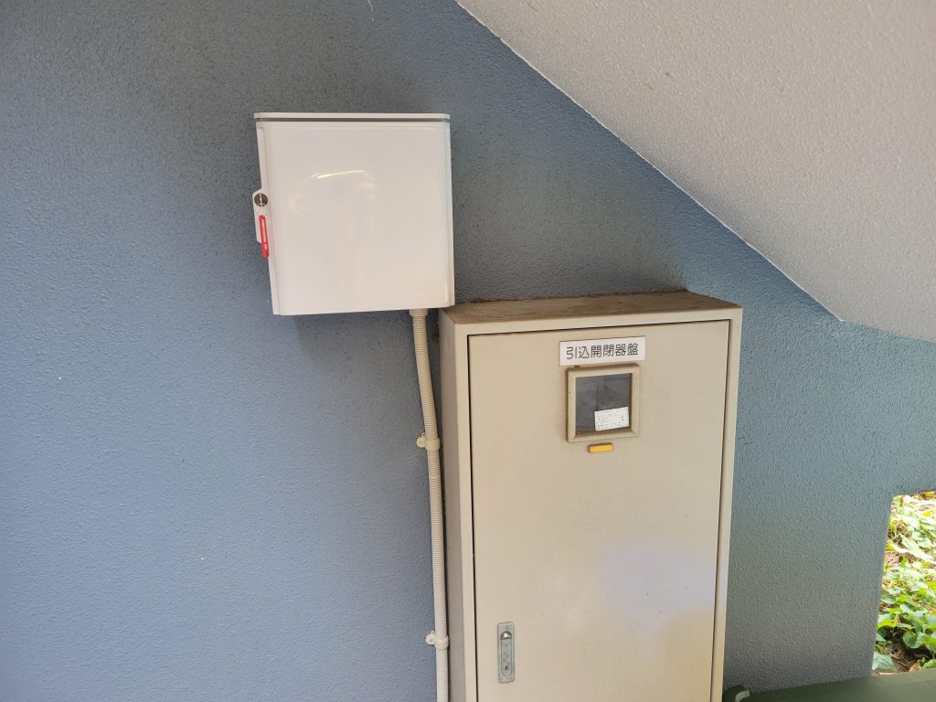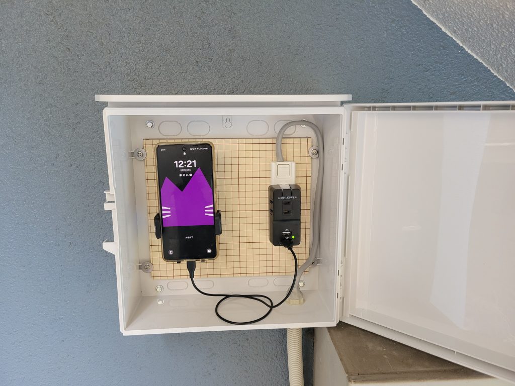 100V電源が取れる場所に屋外用収納ボックスを設置し、その中にスマホを入れてテザリング機能をONにしています。